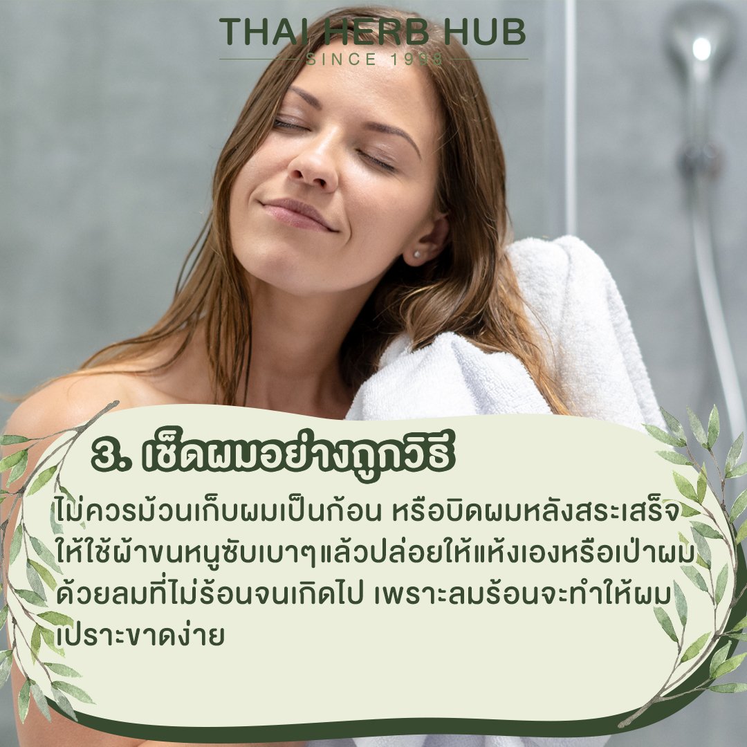 ทำผมให้แห้งอย่างระมัดระวังมากขึ้น และไม่ควรม้วนเก็บผมเป็นก้อน หรือบิดผมหลังสระเสร็จ เพราะสามารถทำให้โครงสร้างเส้นผมหักได้ ถ้าอยากผมหนาขึ้นก็ต้องดูแลผมตั้งแต่ขั้นพื้นฐานให้ดี โดยหลังสระผมเสร็จให้ใช้ผ้าขนหนูซับเบาๆ แล้วปล่อยให้แห้งเองหรือเป่าผมด้วยลมที่ไม่ร้อนจนเกิดไป เพราะลมร้อนจะทำให้ผมเปราะขาดง่าย