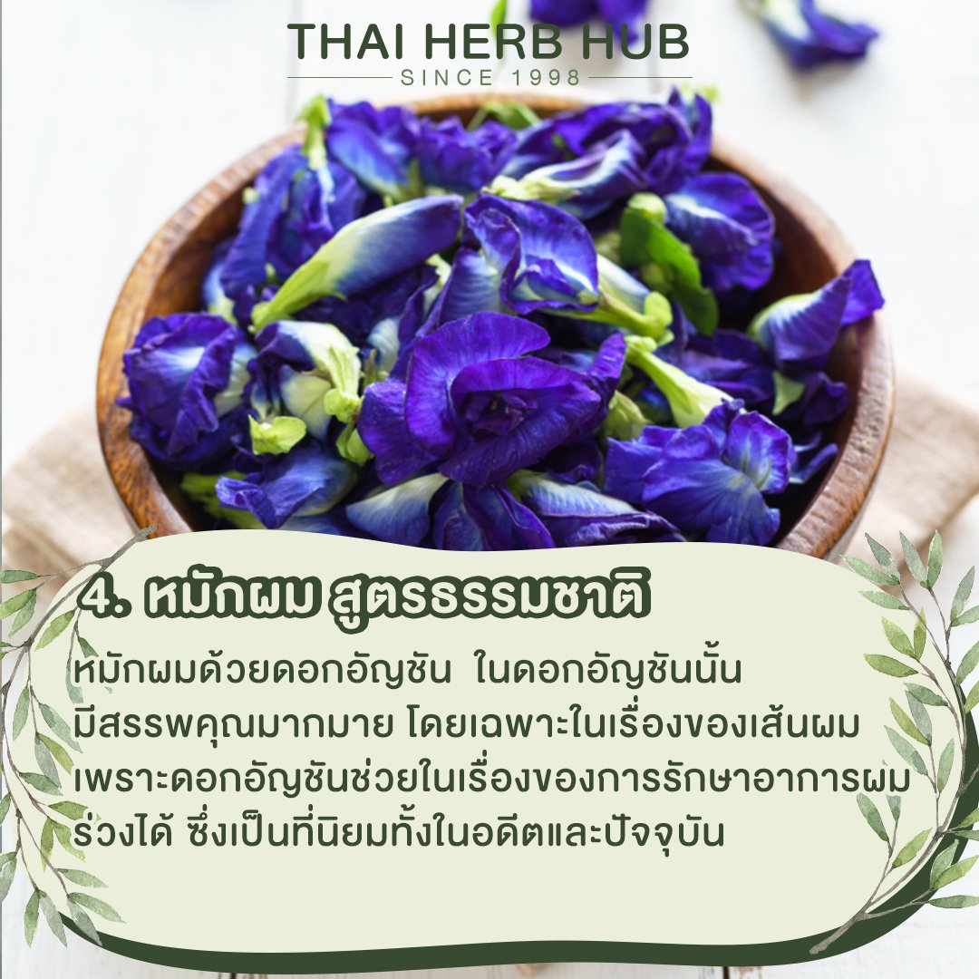 หมักผมด้วยดอกอัญชัน ในดอกอัญชันนั้น มีสรรพคุณมากมาย โดยเฉพาะในเรื่องของเส้นผม เพราะดอกอัญชันช่วยในเรื่องของการรักษาอาการผมร่วงได้ ซึ่งเป็นที่นิยมทั้งในอดีตและปัจจุบัน โดยสูตรแบบธรรมชาตินั้น ให้นำดอกอัญชัน 10-15 ดอก ล้างน้ำให้สะอาด ใส่ดอกอัญชันลงไปในเครื่องปั่น เติมน้ำ 1 ถ้วย ปั่นให้ละเอียด นำมากรองด้วยผ้าขาวบาง แค่นี้ก็ได้น้ำอัญชันสด ๆแล้ว ผสมน้ำมันมะกอกลงไป 1 ช้อนโต๊ะ